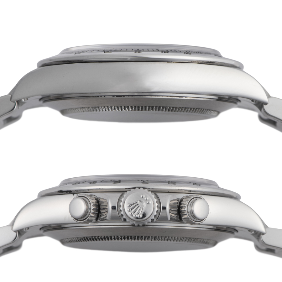 | コンディション | ガラス:欠けやキズはありません 文字盤、針:大変綺麗な状態 ベゼル:目立つ傷などはなく大変綺麗な状態 ケース:目立つ傷などはなく大変綺麗な状態 ブレスレット:鏡面仕上げ部分に微細な拭き傷程度はありますが、大変綺麗な状態 ※弊社で研磨仕上げ済み |