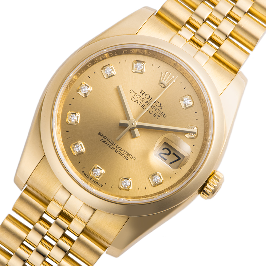 | 商品説明 | ☆K18YGのデイトジャストが入荷致しました。 シャンパンダイアルに10Pのダイヤモンドをセッティングした豪華なモデルです。 ※外装仕上げ済みで、目立つ大きな傷などなく大変綺麗な状態です。 |
