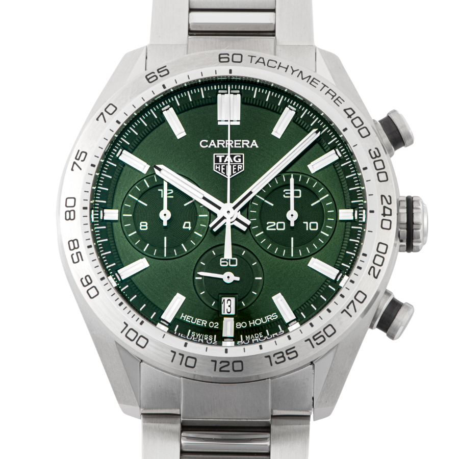 | 商品説明 | ☆モーターレーシングの伝統を物語る輝かしい栄光を纏ったタグ・ホイヤー カレラ クロノグラフ。 快適性を求めてラグを短くした44 mmのステンレススティール製ケースは、ポリッシュとサテン仕上げが相互に施され、時計をさらに薄くスマートに見せています。 自社製ムーブメント キャリバー ホイヤー02を搭載し、グリーンのダイヤルにはサーキュラーサテン仕上げが施されています。 3つのサブダイヤルも6時位置の日付表示も、完璧な視認性を誇ります。 表示価格は現金価格となります。 通常ローンはご利用いただけます。 |
