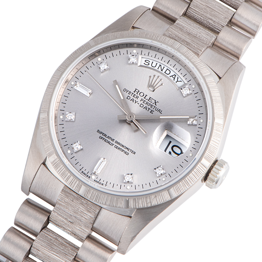 | 商品説明 | ☆ベゼルとブレスレットの中央部にバーク仕上げが施されているのが特徴的でイエローゴールド製と違い、ホワイトゴールド製はほとんどお目にかかることがないとてもレアなモデルです。 ※外装仕上げ済みですが5時位置のラグ角に当て傷が残っております。 ブレスにやや伸びがありますが、目立つ大きな傷や致命的なダメージはなく概ね綺麗な状態です。 |
