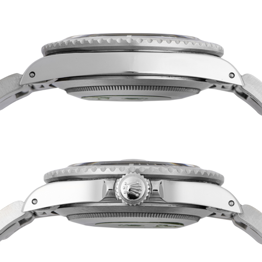 | コンディション | ガラス:角を爪でなぞると僅かに引っかかる程度のガラス欠けがあります(肉眼では見えません) 文字盤・針:経年劣化によるプツプツが文字盤にあり、針にクスミや秒針と分針のトリチウム夜光にひび割れがあります ベゼル:目立たない程度の微細な使用キズが僅かにあるが、大変綺麗な状態 ケース:目立つ大きな傷などはなく大変綺麗な状態 ブレスレット:使用傷が僅かに残るが、目立つ大きな傷などはなく大変綺麗な状態 ※弊社で研磨仕上げ済み |