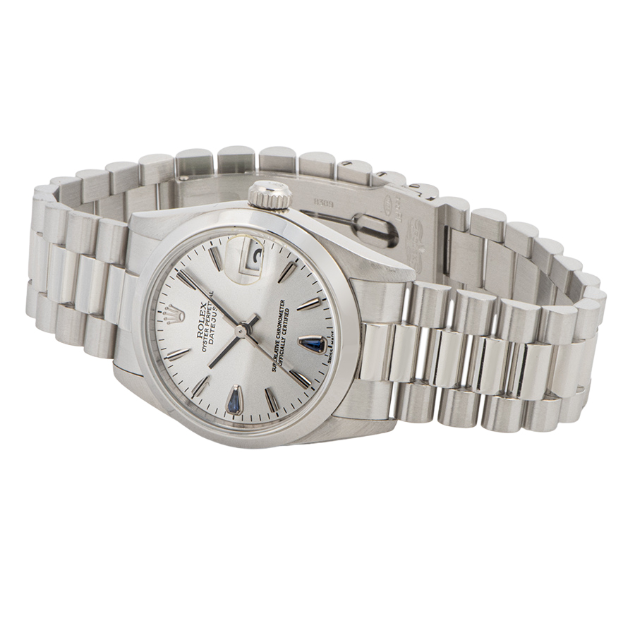 | 商品説明 | ☆本体ケースやブレスレット、全てがプラチナ製のデイデイト、ボーイズサイズです。 インデックスの6時、9時位置にサファイアを使用したあまり見かけない珍しい時計です。 ☆ブレスレット中央のポリッシュ部分に使用に伴う打ち傷がわずかに残っていますが、目立つ程ではなく概ね綺麗な状態です。 |