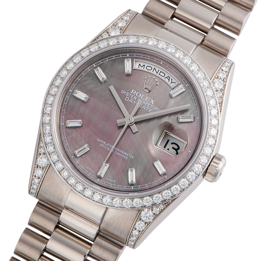 | 商品説明 | ☆ロレックスのラインナップの中で最上級に位置するのがデイデイトです。 素材はゴールドもしくはプラチナ素材のみというラインナップで、ロレックスで唯一フルカレンダー表示を搭載するモデルとなります。 ブラックシェルダイアルに、10ポイントのバケットダイヤ、ベゼルからラグにまでセッティングされたダイヤモンドが大変豪華なモデルです。 ※外装仕上げ済みで、目立つ大きな傷や致命的なダメージなどなく大変綺麗な状態です。 |
