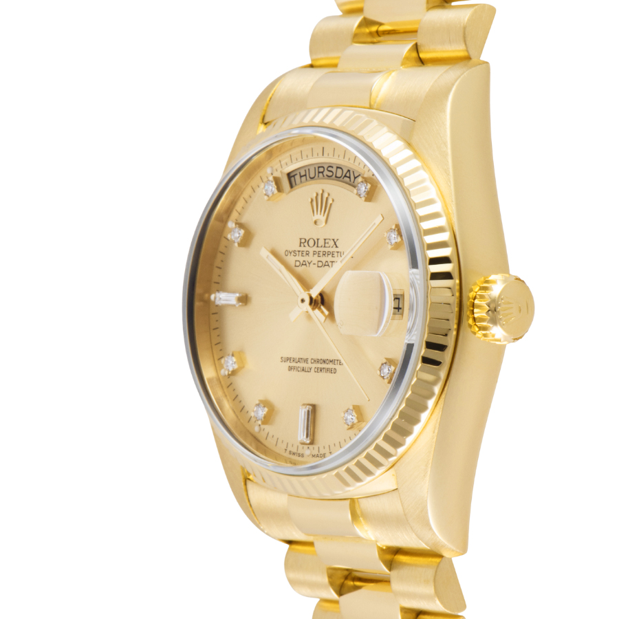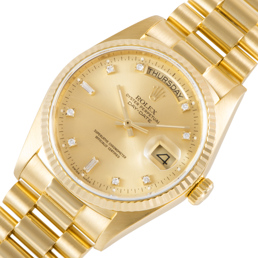 | 商品説明 | ☆ロレックスの最高峰ライン「デイデイト」。18Kイエローゴールド製ケースに、ダイヤモンドインデックスを添えた華やかな一本です。 36mmケースにフルーテッドベゼル、曜日と日付をフル表示するデイデイト機構を搭載。重厚感と品格を兼ね備えたデザインは、まさにステータスシンボル。 表示価格は現金価格となります。 通常ローンはご利用いただけます。 |