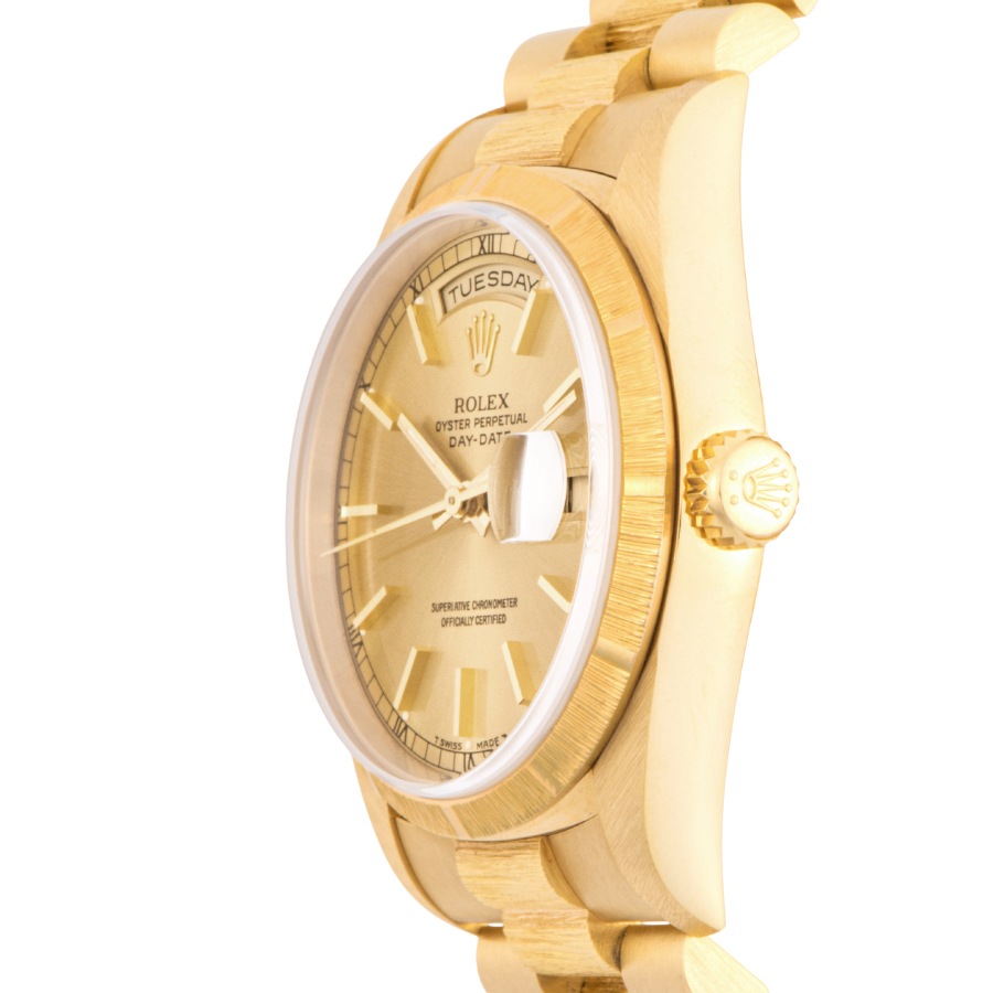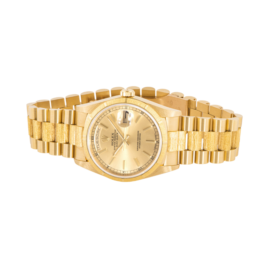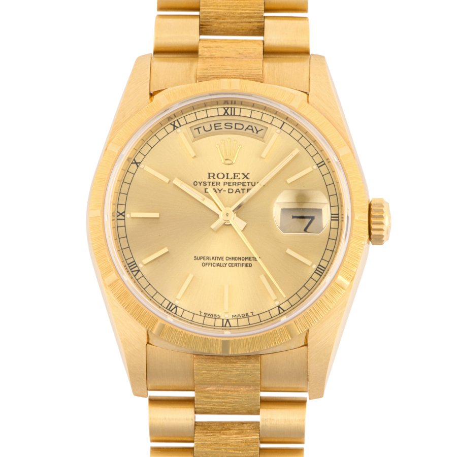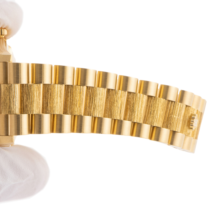 | 商品説明 | ☆ダイアルに8Pのダイヤモンドと2Pバケットダイヤをあしらった豪華なイエローゴールド無垢のデイデイトが入荷しました。 ベゼルとブレスレットの中央部にバーク仕上げが施されているのが特徴的です。 ※研磨痩せの少ない個体になります。 |